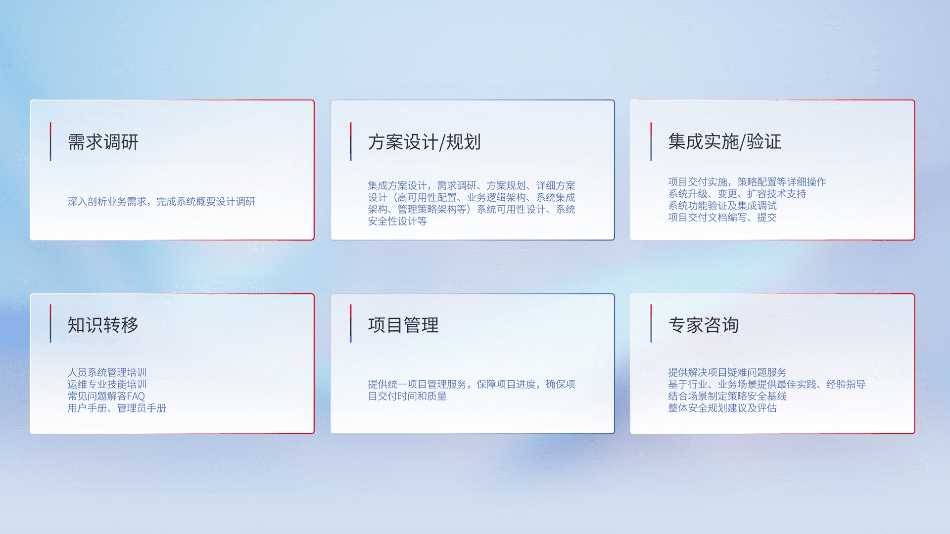 针对客户行业特性,,,,将宏观的安全战略和需求,,,,通过专业的交付服务,,,实现项目落地,,为客户提供标准规范的集成交付服务。。。。